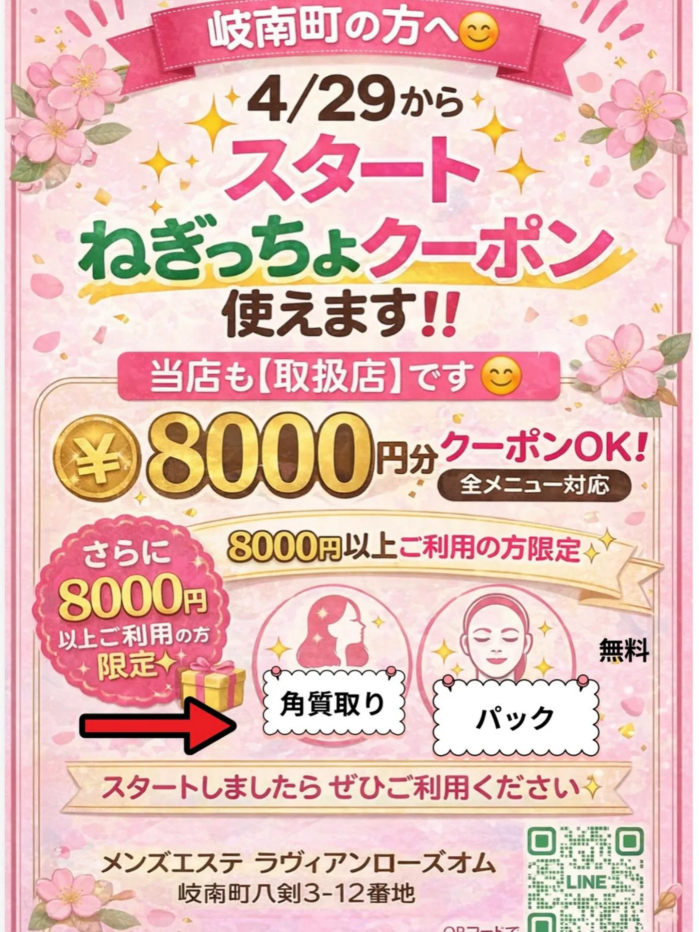新しい季節とともに、自分磨きを始めませんか?🌿当サロンでは、4月29日よりスタートする【ねぎっちょクーポン】が利用可能です!嬉しいことに、【8000円分】の割引でスペシャルケアをお楽しみいただけます🎉